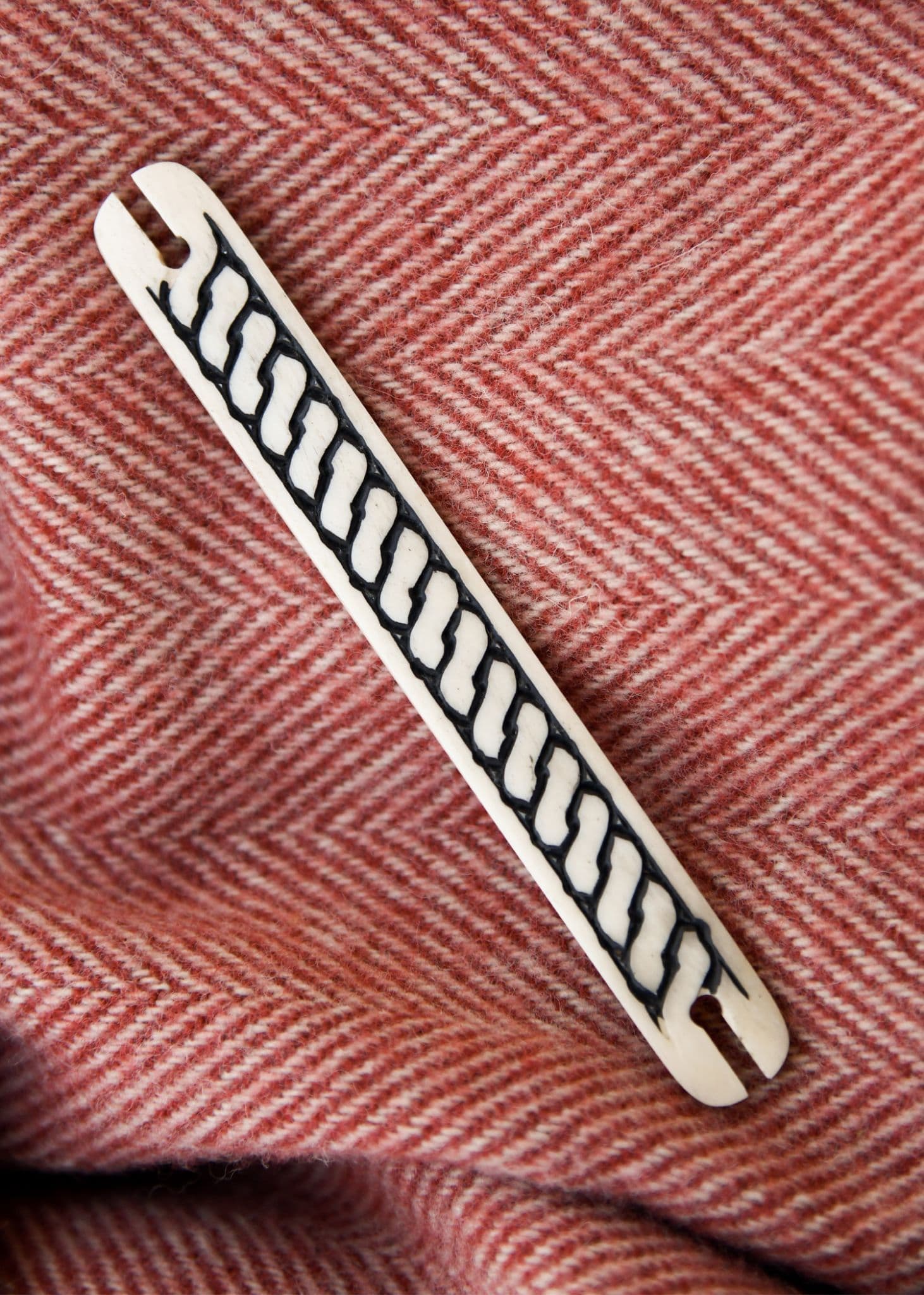 This handcrafted weaving bone shuttle is genuine bone, polished, and has an intricate braided pattern. Weaving was a popular technique in the Middle Ages for producing fine fabrics. An essential tool in this process was the weaving shuttle, which was used to guide the weft thread through the warp threads of the loom, building the cloth thread by thread.
