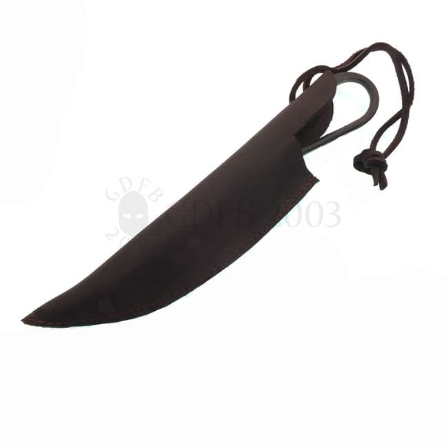 Includes brown leather sheath with leather strap for belt attachment.