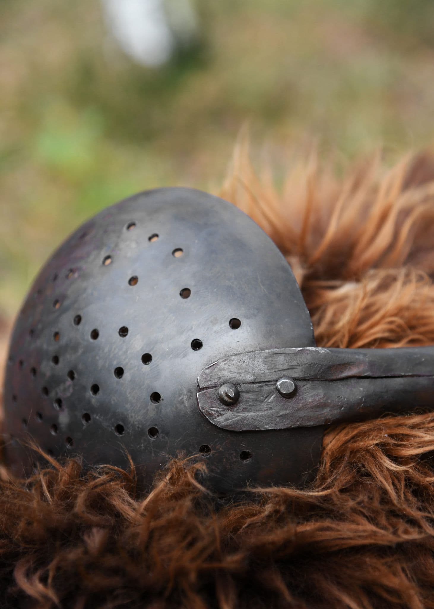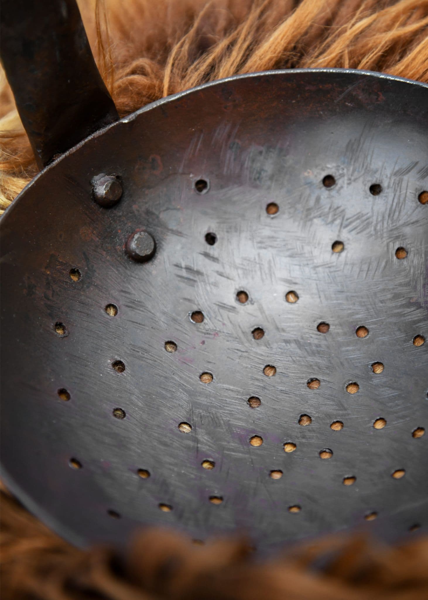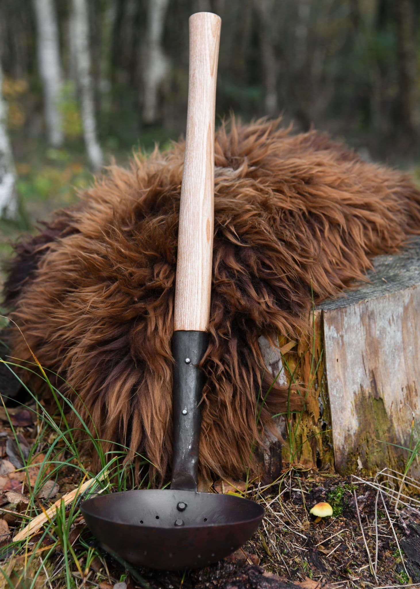 This large skimmer, hand-forged from wrought iron with a strong ash wood handle, is the perfect addition to any kitchen. It is ideal for historical re-enactments of various Medieval eras and adds a rustic charm to any cooking area.