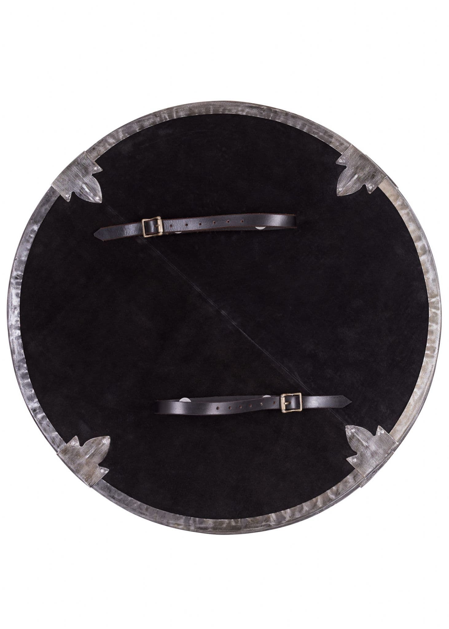The back of the shield is covered with leather and has two leather straps which are are riveted in place.